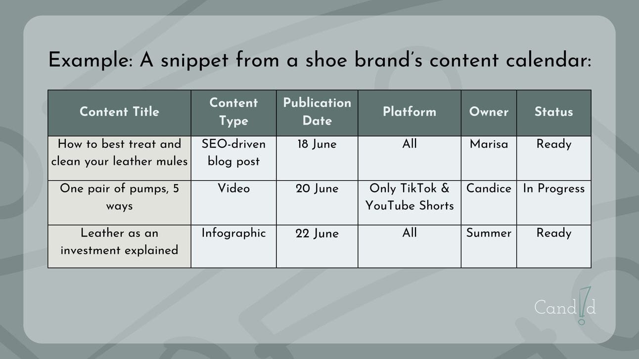 Do you like Miro? Then use it. Are you a fan of Notion or Asana? Then let’s go! Google Sheets also works just fine. It’s about finding a tool that works for you. Here are some suggestions for what your calendar should include, but you can do your own thing here as well: